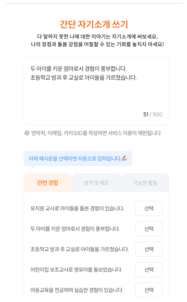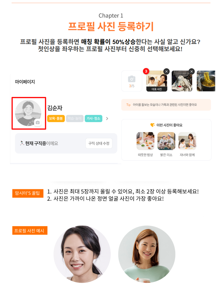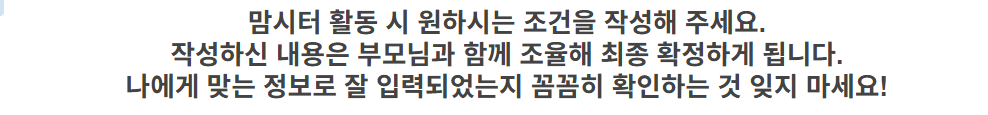 [ 맘시터 회원 가이드 ] 프로필 작성 맘시터CX팀 크롱 2026년 02월 09일 07:41 업데이트 시간 👉 프로필 작성 바로가기 관련 문서 [ 맘시터 회원 가이드 ] 면접 지원/수락 [맘시터 프로 시터] 연결된 부모님과 채팅하기 [돌봄비] 4대 보험을 적용 받을 수 있나요? [소식] 🙋♀️좋은 시터님, 5가지 약속만은 꼭 지켜주세요🙌 [ 맘시터 회원 가이드 ] 돌봄비 정산🎉