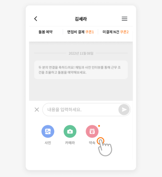 부모님과 맘시터님의 채팅창이 열렸다면, 약속 잡기 기능을 통해 활동 전 인터뷰 약속을 잡아보세요.