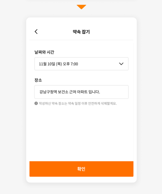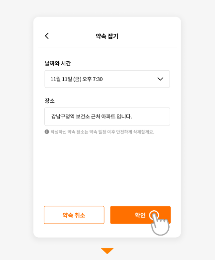 약속하기 메뉴에서 약속 시간과 장소를 등록하시면, 정해진 시간에 맞추어 알림을 보내드려요!