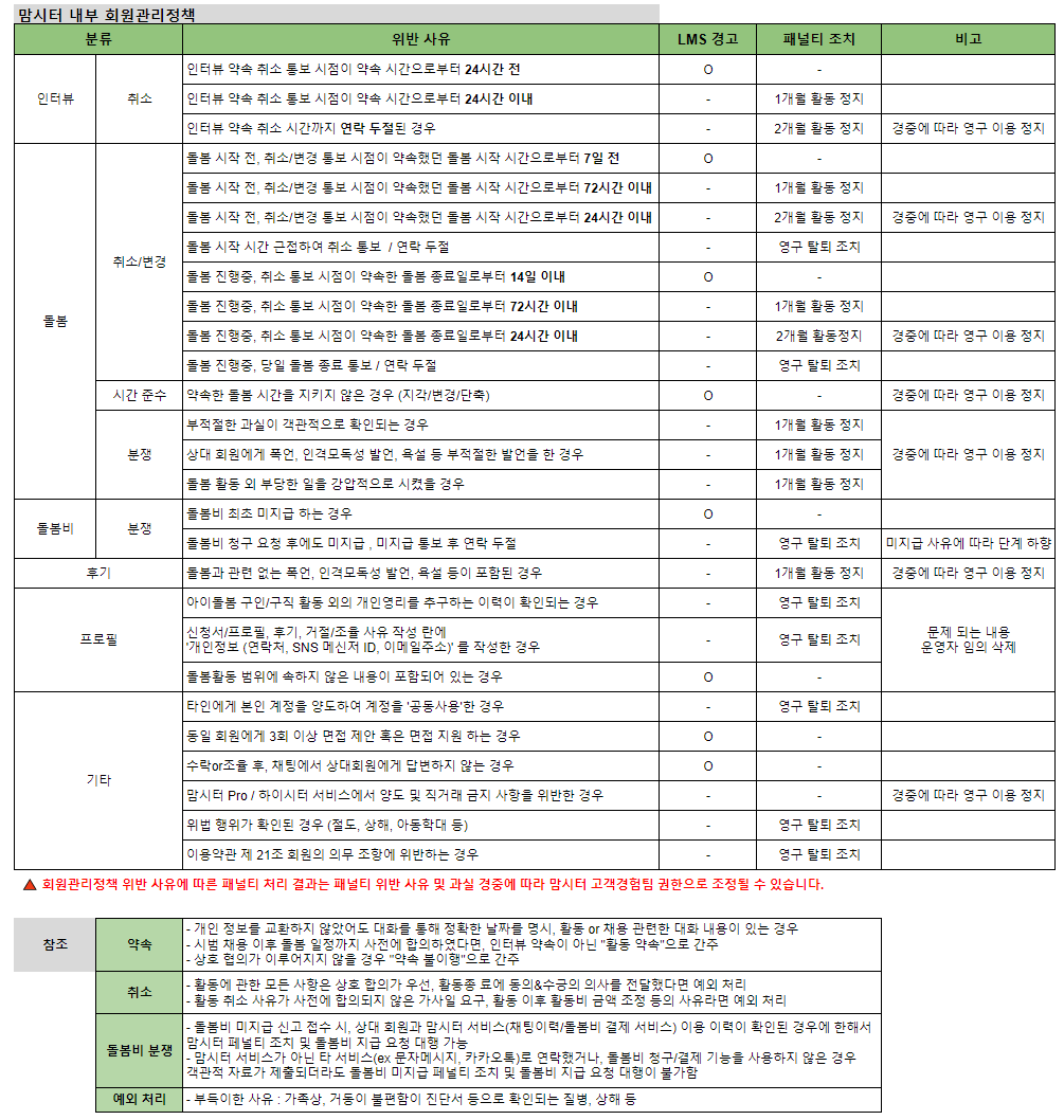 (3) 위반에 따른 패널티 조치는, 과실의 경중에 따라 내부 검토를 통해 조치가 가중될 수 있습니다.