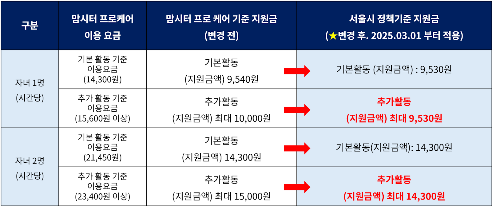 2025년 3월부터 맘시터 프로케어를 이용하시는 서울소상공인 지원사업 부모님의 ‘시간당 돌봄비 지원금액’에 변동이 있어 안내드립니다.