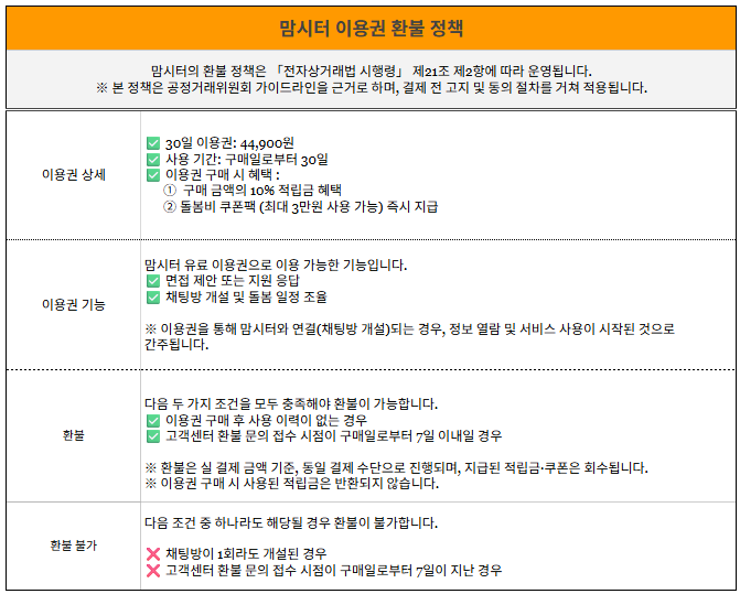 [정책] 맘시터 이용권 환불 정책 맘시터팀 그로밋 2025년 09월 26일 03:36 업데이트 시간 🙌고객센터 1:1 문의 남기기 (click) 관련 문서 [정책] 맘시터 후기 운영 정책 [취소] 결제를 취소하고 싶어요. [정책] 맘시터 환불 정책 안내 (24. 5. 17 적용) [이용약관] 맘시터 서비스 이용약관 [부모회원 가이드] 이용권 구매하기