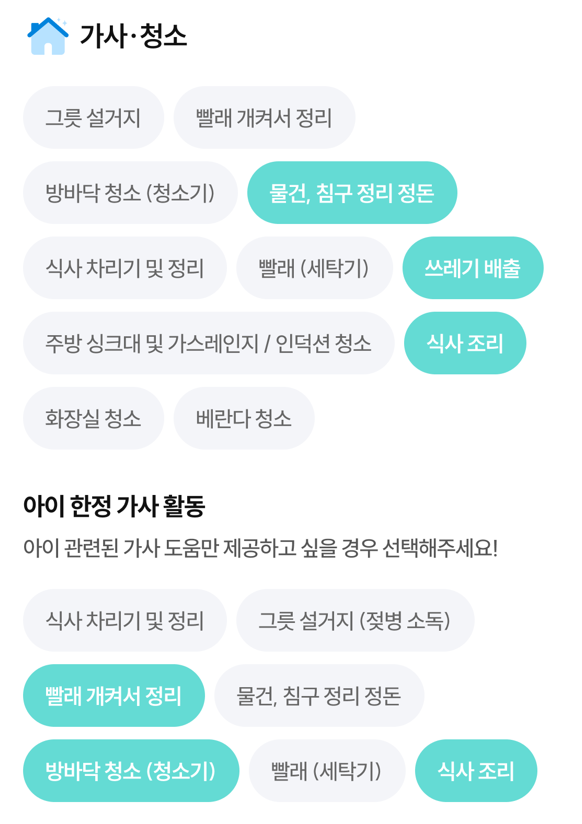 π§Ό κ°μ¬/μ²μ νλμ κΈ°μ‘΄μ²λΌ μμ΄ μ€μ¬μ κ°μ¬ νλλ§ μ ννκ±°λ, μνμ λ€λ©΄ μ±μΈ λμ κ°μ¬ νλκΉμ§ νμ₯ν΄μ μ€μ νμ€ μ μμ΄μ.