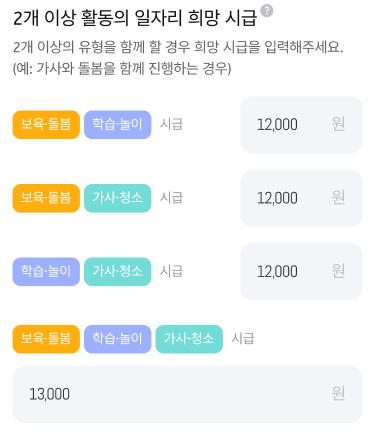 ex) 활동 별 시급을 각각 11,000원씩 설정하셨다면 보육돌봄과 학습놀이 활동 선택시 받을 수 있는 시급은 22,000원이 아니에요.